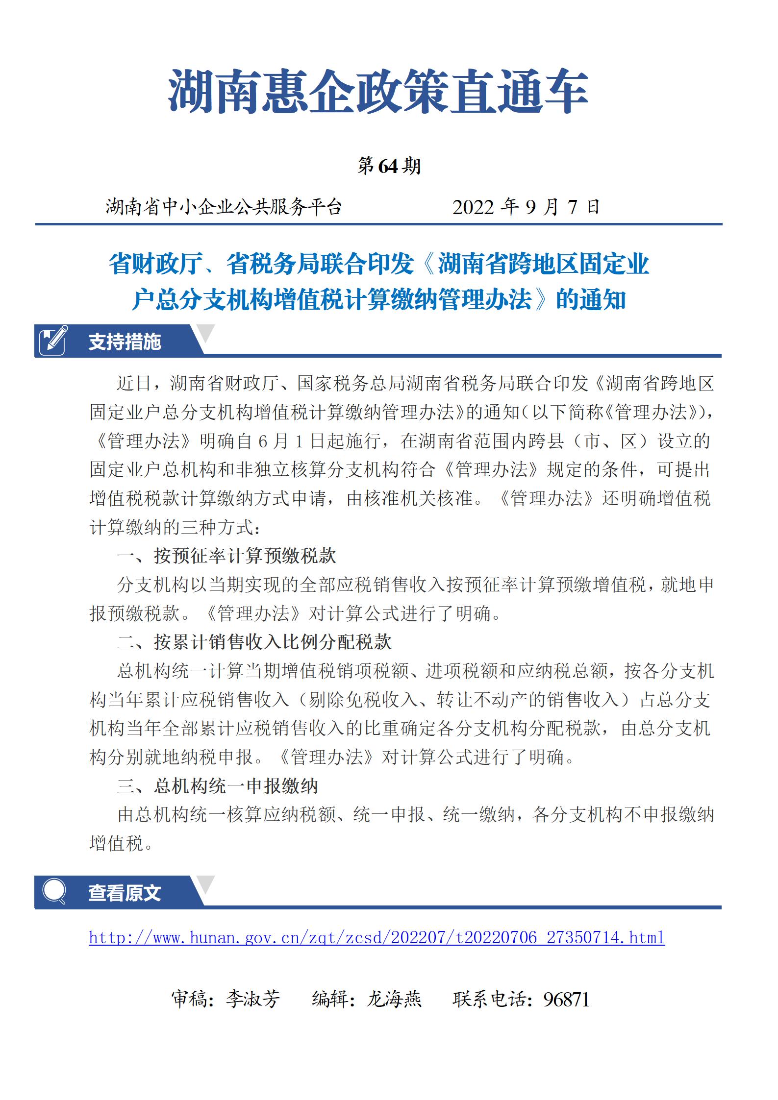 省財(cái)政廳、省稅務(wù)局聯(lián)合印發(fā)《湖南省跨地區(qū)固定業(yè)戶(hù)總分支機(jī)構(gòu)增值稅計(jì)算繳納管理辦法》的通知