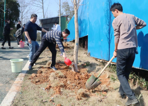 植樹現(xiàn)場,在和煦的春風(fēng)吹拂下,大家手持鋤頭、鐵鏟,干勁十足,三五一組,鏟土造坑、培土圍堰、提水澆灌,配合默契,共栽下銀杏、柳樹、桃樹等500余棵。一株株新栽樹苗迎風(fēng)挺立,呈現(xiàn)出勃勃生機,為初春的歸古景區(qū)增添了一抹盎然生機,為建設(shè)綠色婁底繪就了一片新綠。